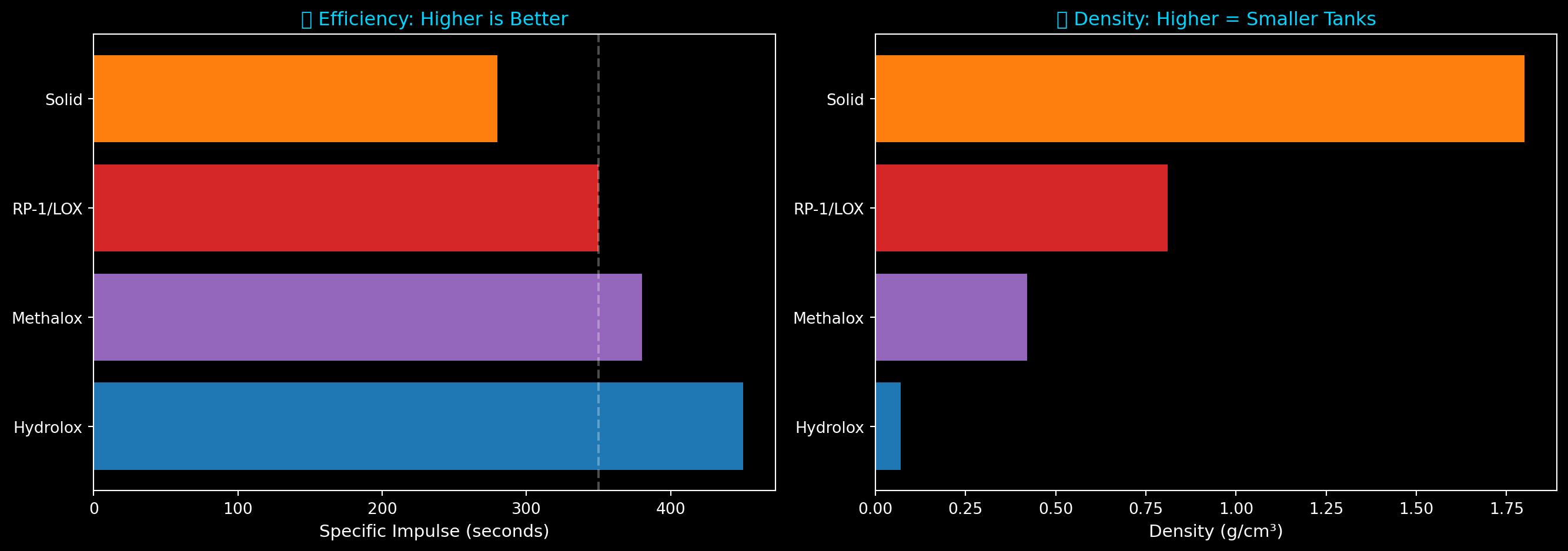 # Visualize the trade-offfig, (ax1, ax2) = plt.subplots(1, 2, figsize=(14, 5))names = [p.split(" (")[0] for p in PROPELLANTS.keys()]isp_values = [p["isp_vac"] for p in PROPELLANTS.values()]density_values = [p["density"] for p in PROPELLANTS.values()]colors = ['#1f77b4', '#9467bd', '#d62728', '#ff7f0e']# Efficiency chartax1.barh(names, isp_values, color=colors)ax1.set_xlabel('Specific Impulse (seconds)', fontsize=11)ax1.set_title('π― Efficiency: Higher is Better', color='#00d4ff')ax1.axvline(x=350, color='white', linestyle='--', alpha=0.3, label='LEO baseline')# Density chart ax2.barh(names, density_values, color=colors)ax2.set_xlabel('Density (g/cmΒ³)', fontsize=11)ax2.set_title('π¦ Density: Higher = Smaller Tanks', color='#00d4ff')plt.tight_layout()plt.show()print("\nπ€ THE GOLDILOCKS PROBLEM:")print(" β’ Hydrogen: BEST efficiency... but tanks are HUGE (Space Shuttle's orange tank)")print(" β’ Kerosene: Dense and powerful... but lower efficiency, leaves soot")print(" β’ Methane: Just right! Good efficiency AND reasonable tank size")print("\n This is why SpaceX chose methane for Starship!")