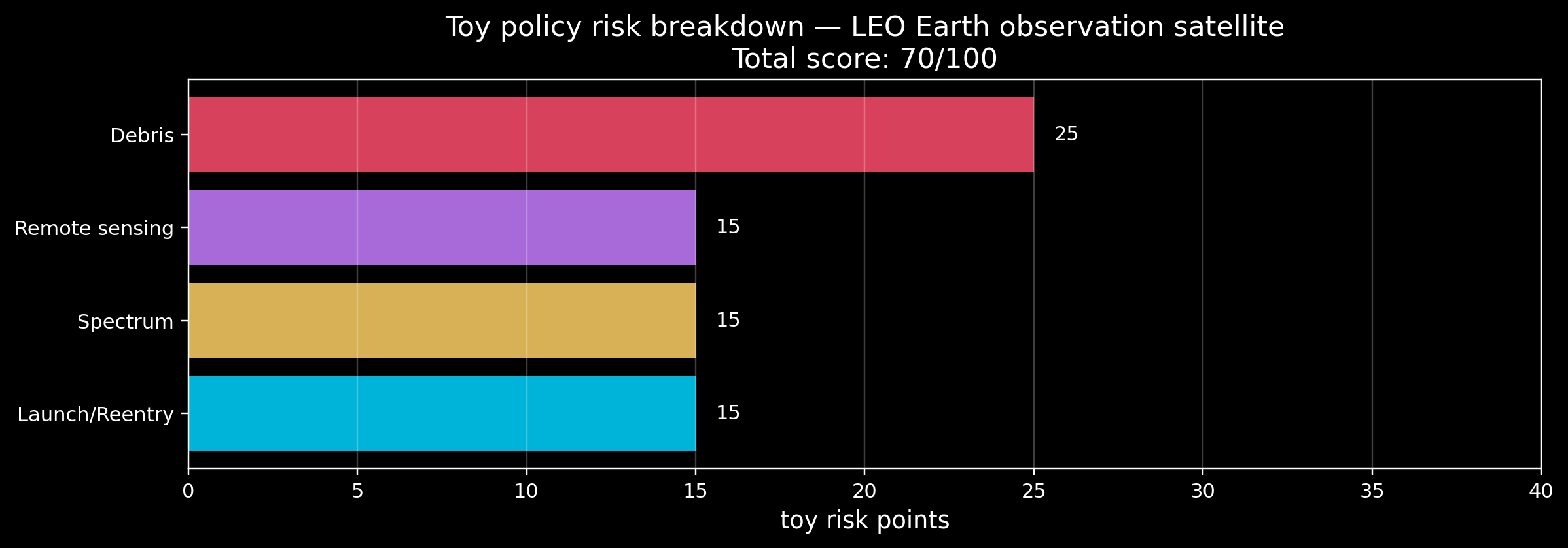 MISSION_PRESETS = {"LEO communications satellite": {"crewed": False,"earth_observation": False,"uses_spectrum": True,"altitude_km": 550,"disposal_plan": True, },"LEO Earth observation satellite": {"crewed": False,"earth_observation": True,"uses_spectrum": True,"altitude_km": 650,"disposal_plan": True, },"GEO communications satellite": {"crewed": False,"earth_observation": False,"uses_spectrum": True,"altitude_km": 35786,"disposal_plan": True, },"Crewed capsule (LEO)": {"crewed": True,"earth_observation": False,"uses_spectrum": True,"altitude_km": 400,"disposal_plan": True, },"Mars transfer spacecraft": {"crewed": False,"earth_observation": False,"uses_spectrum": True,"altitude_km": 0,"disposal_plan": False,"planetary_protection": True, },}def policy_risk_score(mission: dict) ->dict:"""Return a breakdown + total score (0-100). Toy model for learning only.""" breakdown = {}# Launch / reentry licensing tends to be more intense for crewed or high-energy missions. launch =15if mission.get("crewed"): launch +=20if mission.get("planetary_protection"): launch +=10 breakdown["launch_reentry"] =min(30, launch)# Spectrum always matters if you transmit. spectrum =15if mission.get("uses_spectrum") else0 breakdown["spectrum"] = spectrum# Earth observation tends to add licensing + data controls. eo =15if mission.get("earth_observation") else0 breakdown["remote_sensing"] = eo# Debris risk is often higher in crowded LEO and depends on disposal plan. alt = mission.get("altitude_km", 0) debris =5if300<= alt <=2000: # crowded LEO debris +=20elif alt >2000: debris +=10ifnot mission.get("disposal_plan", False): debris +=15 breakdown["debris"] =min(35, debris) total =sum(breakdown.values())return {"breakdown": breakdown, "total": min(100, total)}def plot_breakdown(label: str): result = policy_risk_score(MISSION_PRESETS[label]) parts = result["breakdown"]# Keep category order stable (visual consistency) order = ["launch_reentry", "spectrum", "remote_sensing", "debris"] names = [k for k in order if k in parts] values = np.array([parts[k] for k in names]) labels_pretty = {"launch_reentry": "Launch/Reentry","spectrum": "Spectrum","remote_sensing": "Remote sensing","debris": "Debris", } colors = {"launch_reentry": ACCENT,"spectrum": "#ffd166","remote_sensing": "#c77dff","debris": DANGER, } display_names = [labels_pretty.get(k, k) for k in names] bar_colors = [colors.get(k, ACCENT) for k in names] fig, ax = plt.subplots(figsize=(11, 3.9)) bars = ax.barh(display_names, values, color=bar_colors, alpha=0.85) ax.set_xlim(0, 40) ax.set_title(f"Toy policy risk breakdown — {label}\nTotal score: {result['total']}/100") ax.set_xlabel("toy risk points") ax.grid(True, axis="x", alpha=0.25)for b in bars: ax.text(b.get_width() +0.6, b.get_y() + b.get_height() /2, f"{b.get_width():.0f}", va="center") plt.tight_layout() plt.show()plot_breakdown("LEO Earth observation satellite")