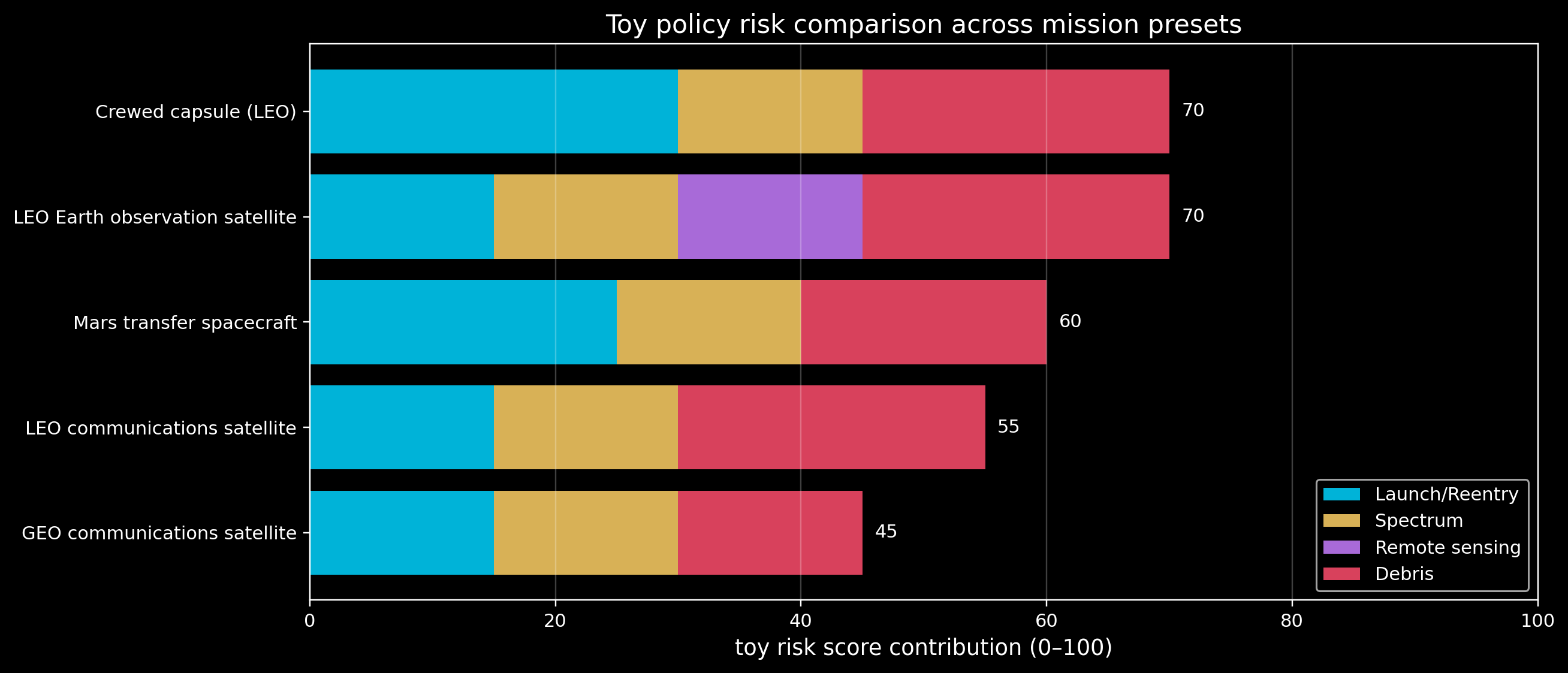 order = ["launch_reentry", "spectrum", "remote_sensing", "debris"]labels_pretty = {"launch_reentry": "Launch/Reentry","spectrum": "Spectrum","remote_sensing": "Remote sensing","debris": "Debris",}colors = {"launch_reentry": ACCENT,"spectrum": "#ffd166","remote_sensing": "#c77dff","debris": DANGER,}rows = []for name, m in MISSION_PRESETS.items(): out = policy_risk_score(m) row = {"mission": name, "total": out["total"]}for k in order: row[k] = out["breakdown"].get(k, 0) rows.append(row)df_all = pd.DataFrame(rows).set_index("mission")df_all = df_all.sort_values("total")fig, ax = plt.subplots(figsize=(12, 5.2))left = np.zeros(len(df_all))for k in order: vals = df_all[k].values ax.barh(df_all.index, vals, left=left, color=colors[k], alpha=0.85, label=labels_pretty[k]) left = left + vals# Total labelsfor i, (mission, row) inenumerate(df_all.iterrows()): ax.text(row["total"] +1.0, i, f"{int(row['total'])}", va="center")ax.set_xlim(0, 100)ax.set_title("Toy policy risk comparison across mission presets")ax.set_xlabel("toy risk score contribution (0–100)")ax.grid(True, axis="x", alpha=0.25)ax.legend(loc="lower right")plt.tight_layout()plt.show()