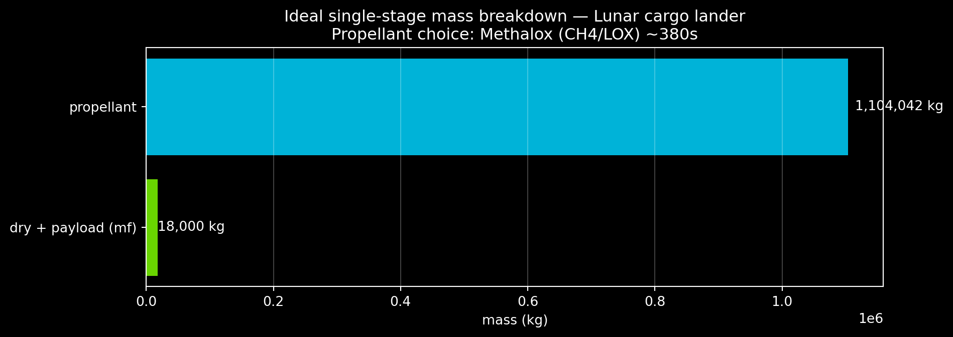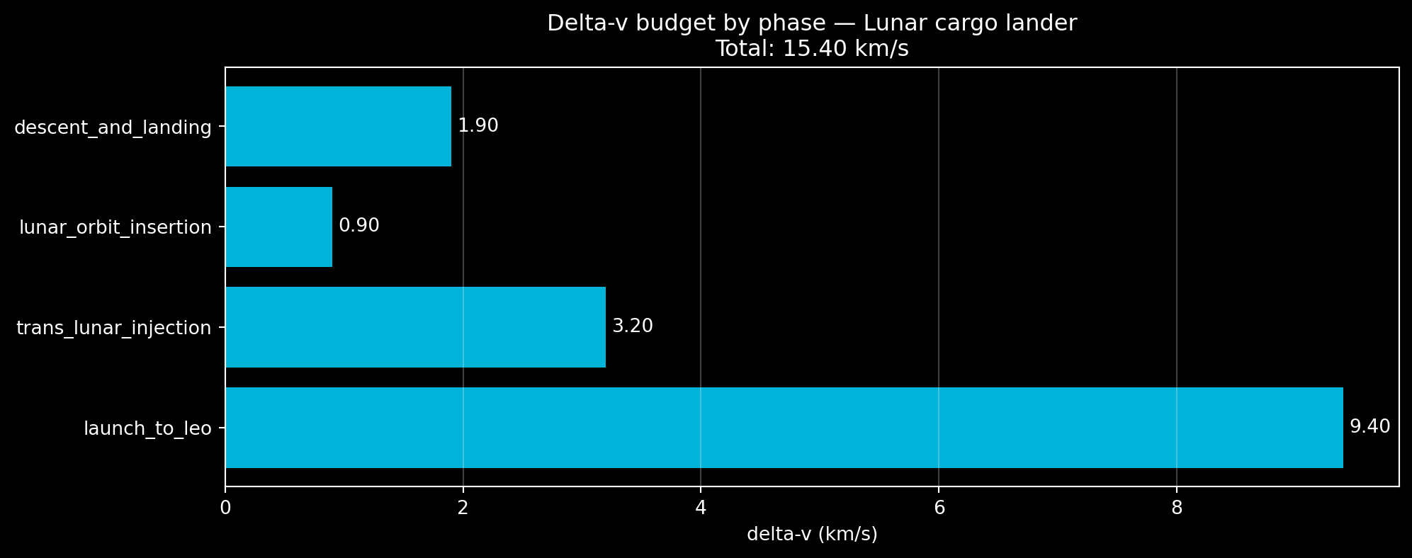 MISSION_LIBRARY = {"LEO Earth observation satellite": {"agency_context": "Examples: NASA Landsat, ESA Sentinel, ISRO Cartosat (varies by mission).","crewed": False,"payload_kg": 1200,"target": "Sun-synchronous-ish LEO (simplified)","delta_v_budget_m_s": {"launch_to_leo": 9400,"orbit_raise_and_phasing": 150,"stationkeeping_lifetime": 200,"deorbit_disposal": 150, },"max_g": 6.0,"notes": "LEO is crowded: debris mitigation and disposal matter.", },"GEO communications satellite": {"agency_context": "Examples: commercial + national GEO operators; ESA/NASA launches are common.","crewed": False,"payload_kg": 6000,"target": "GEO (simplified)","delta_v_budget_m_s": {"launch_to_leo_equivalent": 9400,"transfer_to_geo": 4300,"stationkeeping_lifetime": 1500,"graveyard_orbit": 20, },"max_g": 6.0,"notes": "Large energy requirement. Often uses an upper stage or onboard electric propulsion.", },"Lunar cargo lander": {"agency_context": "Examples: NASA CLPS, JAXA SLIM, CNSA Chang'e landers (varies by mission).","crewed": False,"payload_kg": 3000,"target": "Lunar surface (simplified)","delta_v_budget_m_s": {"launch_to_leo": 9400,"trans_lunar_injection": 3200,"lunar_orbit_insertion": 900,"descent_and_landing": 1900, },"max_g": 8.0,"notes": "No atmosphere: landing is propulsive. Precision + guidance matter.", },"Mars cargo transfer": {"agency_context": "Examples: NASA/ESA robotic Mars missions; future cargo/crewed concepts.","crewed": False,"payload_kg": 20000,"target": "Mars transfer + surface arrival (simplified)","delta_v_budget_m_s": {"launch_to_leo": 9400,"trans_mars_injection": 3600,"midcourse_corrections": 50,"entry_descent_landing": 1500, },"max_g": 5.0,"notes": "Mars has an atmosphere, so some energy can be removed aerodynamically.", },}mission_name ="Lunar cargo lander"# try changing thismission = MISSION_LIBRARY[mission_name]# Flatten to a quick table for readabilitybudget_rows = [(k, v) for k, v in mission["delta_v_budget_m_s"].items()]df_req = pd.DataFrame( {"field": ["agency_context", "target", "crewed", "payload_kg", "max_g", "notes"],"value": [ mission["agency_context"], mission["target"], mission["crewed"], mission["payload_kg"], mission["max_g"], mission["notes"], ], })df_dv = pd.DataFrame(budget_rows, columns=["phase", "delta_v_m_s"])print("Mission:", mission_name)display(df_req)display(df_dv)